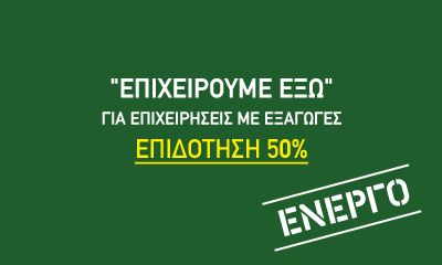 Πρόγραμμα επιδότησης ΕΣΠΑ “Eπιχειρούμε Έξω“ για συμμετοχή σε διεθνείς εμπορικές εκθέσεις Ύψος Επιδότησης €20.000-€100.000 Επιδότηση 50% Ύψος Επιδότησης €20.000-€100.000 Ύψος Επιδότησης €20.000-€100.000 Το πρόγραμμα αφορά την επιδότηση εξωστρεφών μεταποιητικών επιχειρήσεων για την συμμετοχή τους σε διεθνείς εμπορικές εκθέσεις. Ποσοστό επιδότησης 50%. Δικαιούχοι είναι οι πολύ μικρές, μικρές και μεσαίες ελληνικές μεταποιητικές επιχειρήσεις που αναπτύσσουν ήδη εξαγωγική δραστηριότητα.…